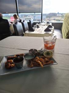 I decided upon my standard go-to drink of an Old Fashioned for my cocktail. I started with the appetizer sampler, which consisted of Filet Mignon Cigars, Scallops, Bacon Wrapped Shrimp, and Fried Calamari. The Filet Mignon Cigars were my favorite out of each: chopped Filet Mignon wrapped and fried in a breading and came with a siracha cream sauce. The scallops were seared in a lemon butter sauce, sitting on top of poblano cheddar grits, and came with a champagne beurre blanc which was a beautiful sauce that, to be honest, I used to dop the shrimp, calamari, and scallops in.