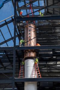 Bardstown, Ky. (August 31, 2023) – Heaven Hill Brands, the nation’s largest family owned and led spirits producer, marked a major milestone today in the more than $200 million project to build a new distillery in the Bourbon Capital of the World. Construction partners and media joined the company as they completed installation of the distillery’s Vendome copper still. This critical piece of the new Heaven Hill Springs Distillery marks a major step towards returning the company’s distilling processes to Bardstown for the first time since the 1996 fire that destroyed the original distillery.