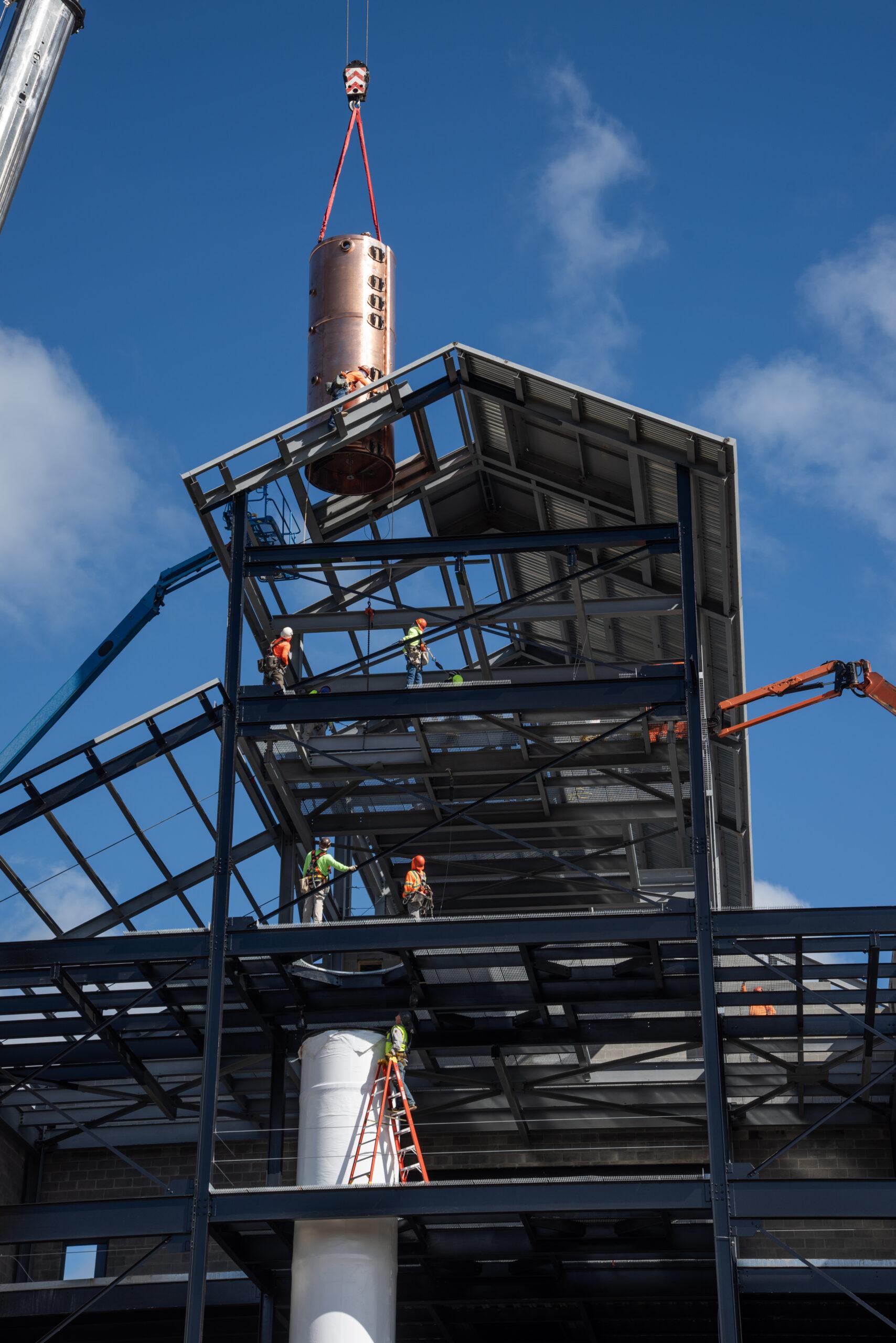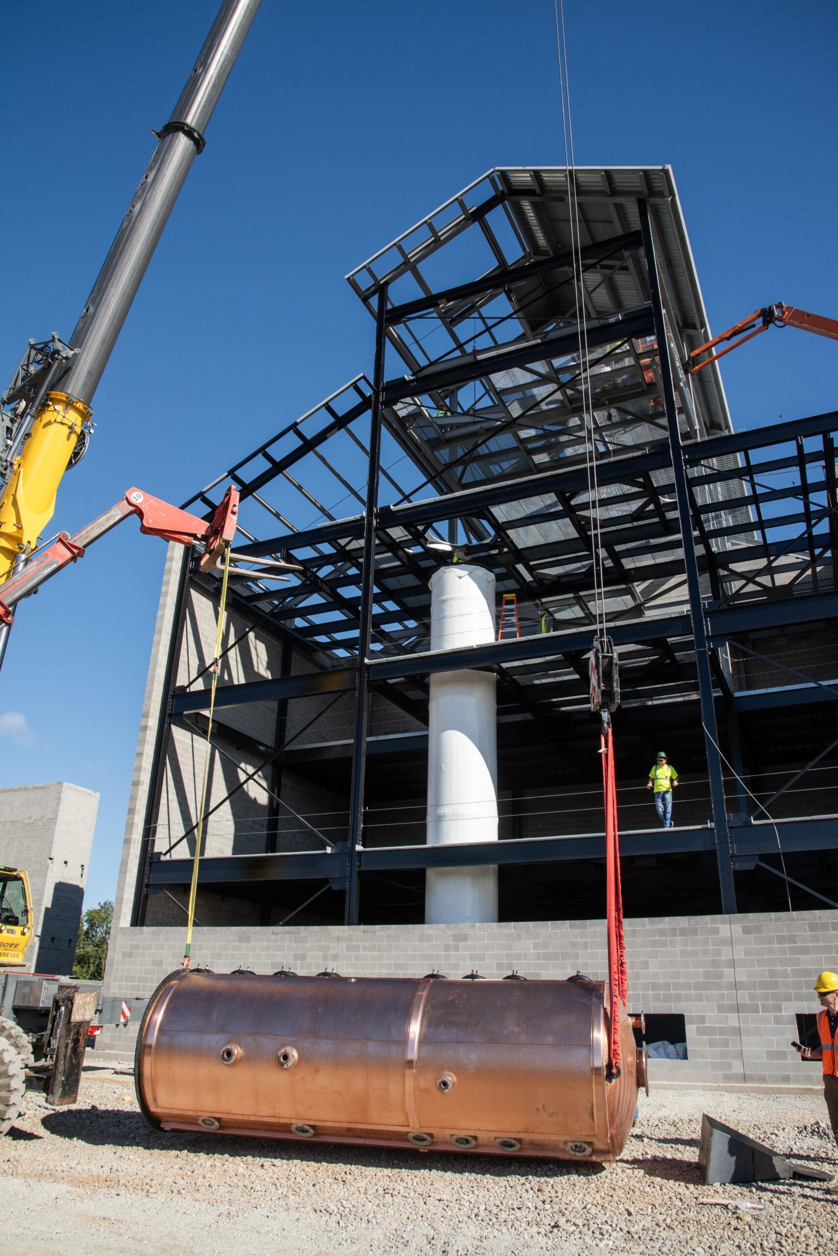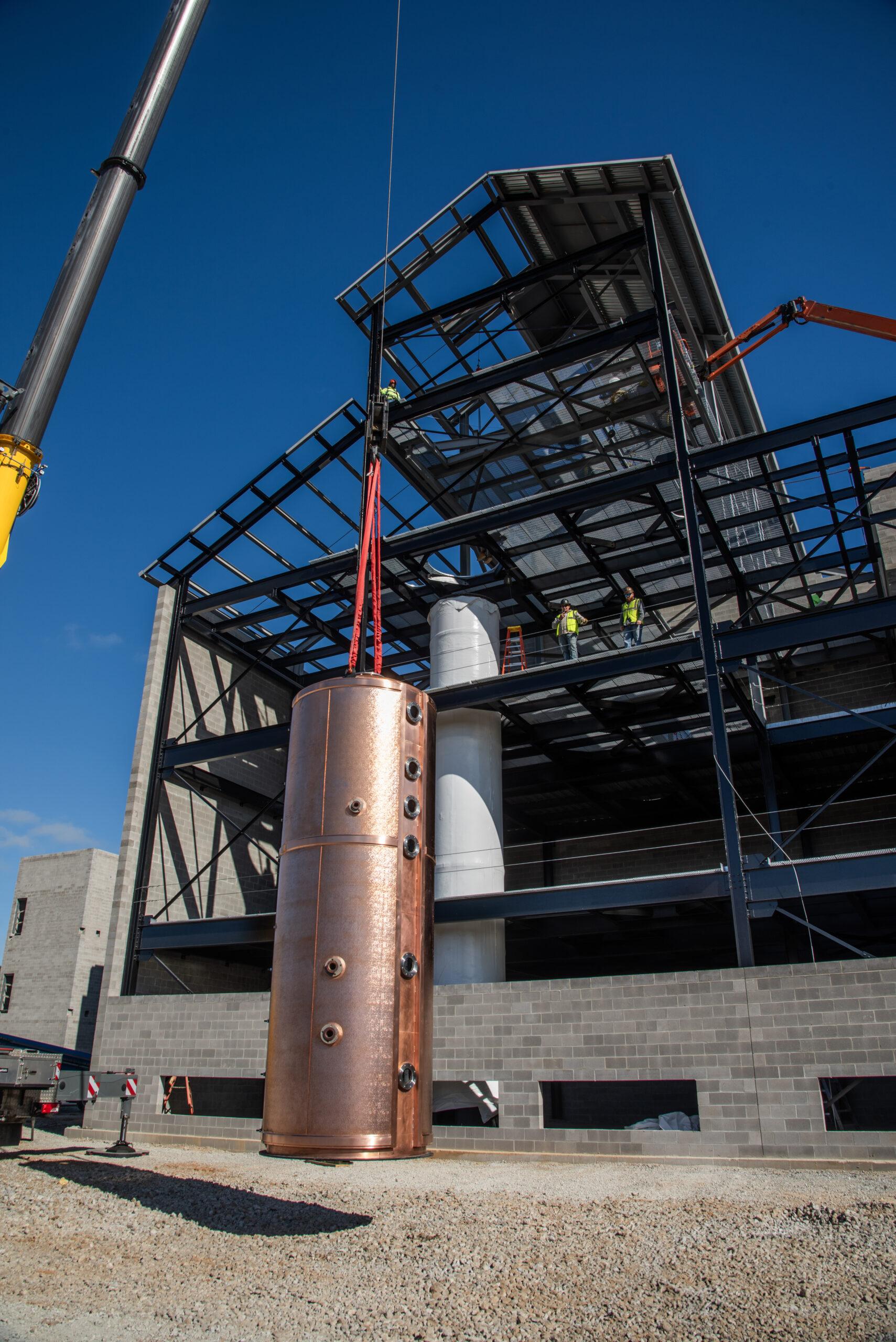 Bardstown, Ky. (August 31, 2023) – Heaven Hill Brands, the nation’s largest family owned and led spirits producer, marked a major milestone today in the more than $200 million project to build a new distillery in the Bourbon Capital of the World. Construction partners and media joined the company as they completed installation of the distillery’s Vendome copper still. This critical piece of the new Heaven Hill Springs Distillery marks a major step towards returning the company’s distilling processes to Bardstown for the first time since the 1996 fire that destroyed the original distillery.